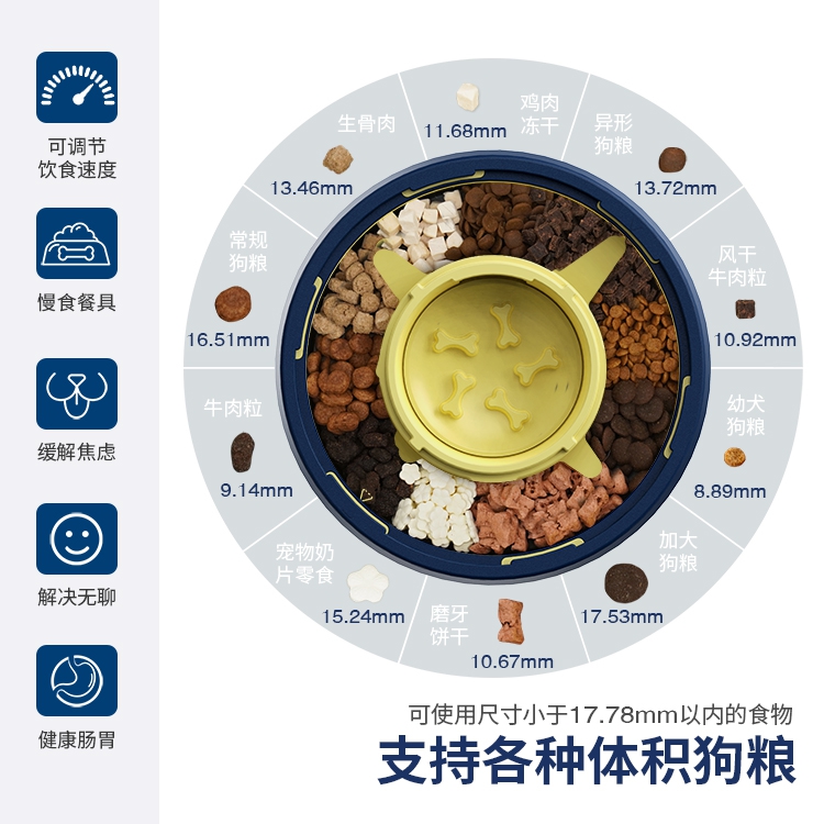 代号:旋转慢食狗碗 这是一款创新设计的狗狗慢食餐具,也是一款真正可以实现狗狗缓慢饮食的狗碗,这款产品可以真正有效的延迟狗狗的进食时间。产品拥有一个超大容量的储粮仓,储粮仓可以放入大约500克的食物(本产品只支持使用宠物干粮或者零食,不支持任何的湿粮和罐头)。将食物加入储粮仓,狗狗通过自己的操作可以获得食物的奖励。通过产品附带的调节功能,可以将狗狗的进食时间控制在5-60分钟。缓慢的饮食习惯可以提升狗狗的肠胃健康与身体素质,并能缓解狗狗的无聊情绪,消耗狗狗的多余精力,而且这个产品还可以作为一个益智玩具给狗狗使用。