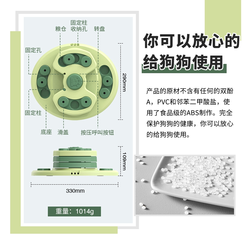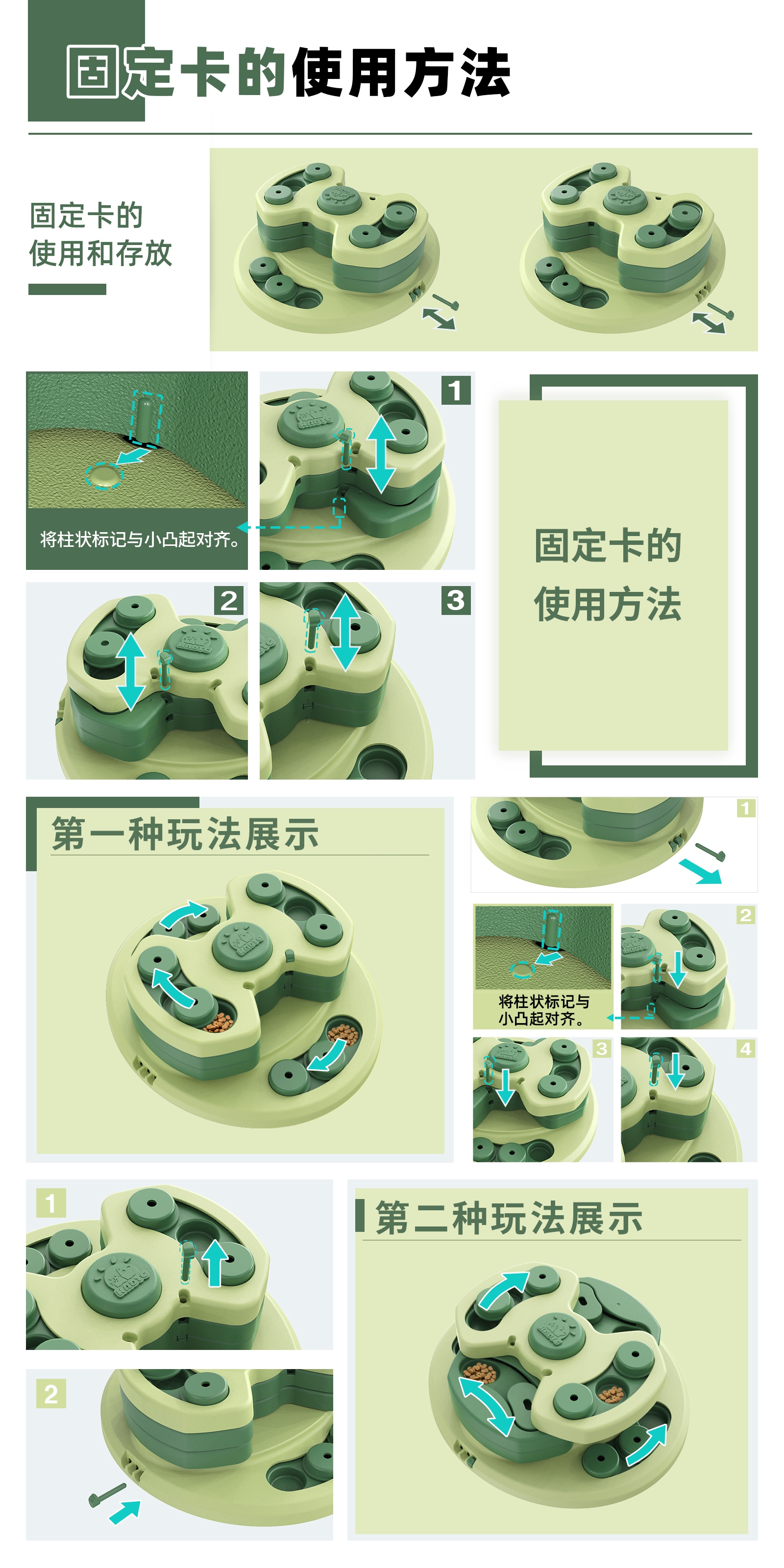代号:旋转魔法塔 这是一款创新设计的狗狗拼图玩具,可以训练狗狗的智力,解决狗狗的无聊情绪,缓解狗狗的焦虑,也是一个慢食玩具。我们将3种玩耍难度集合到一款玩具,从简单到困难,这个玩具就是狗狗的游戏机。这个玩具适用于没有进行过智力开发的宠物或者已经有过初级开发智力的宠物使用。本玩具将三种难度集合到一款玩具,通过逐层移除转盘上的锁定柱,可以从玩法的难度等级从1级逐步调整至3级,取下的锁定柱可以放置于底盘侧边的收纳孔内。狗狗通过玩耍玩具的过程中获得食物奖励,游戏的过程可以引导狗狗进行思考,让狗狗的大脑与身体同时运动起来,促进大脑发育。并可以通过获取食物的过程来刺激狗狗的精神,缓解狗狗的焦虑以及稳定狗狗的性格