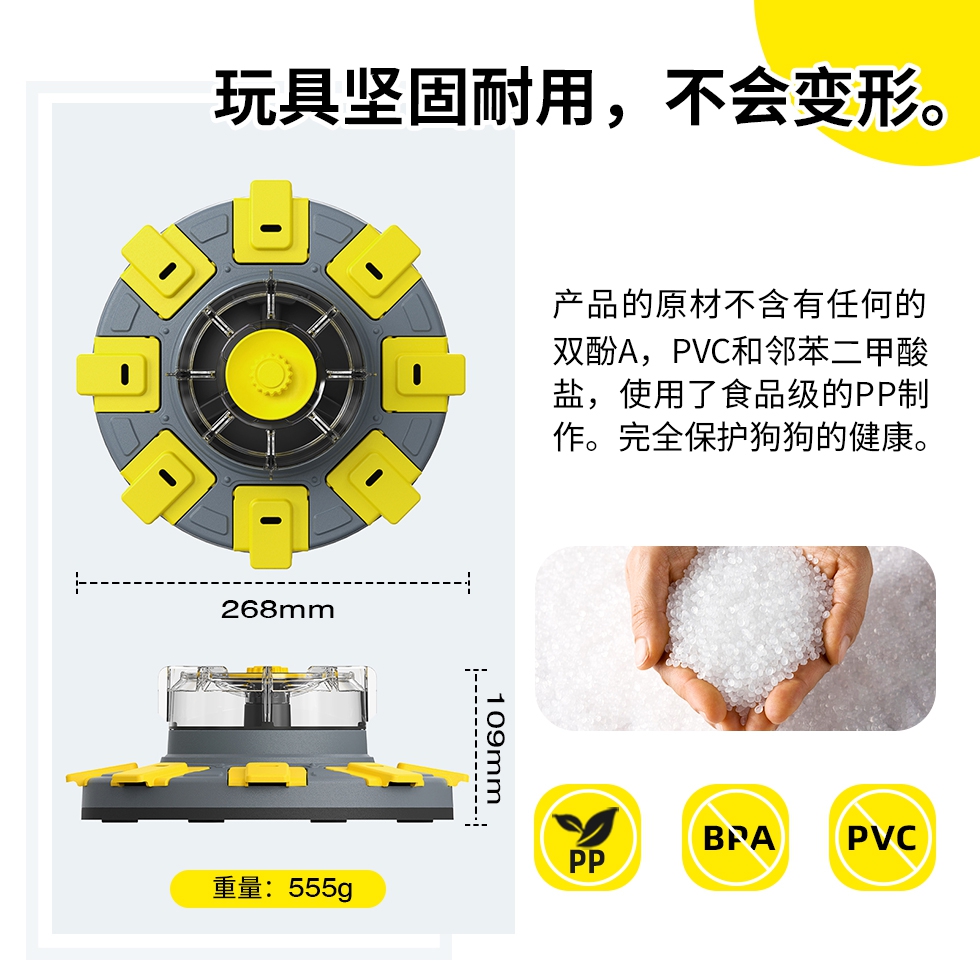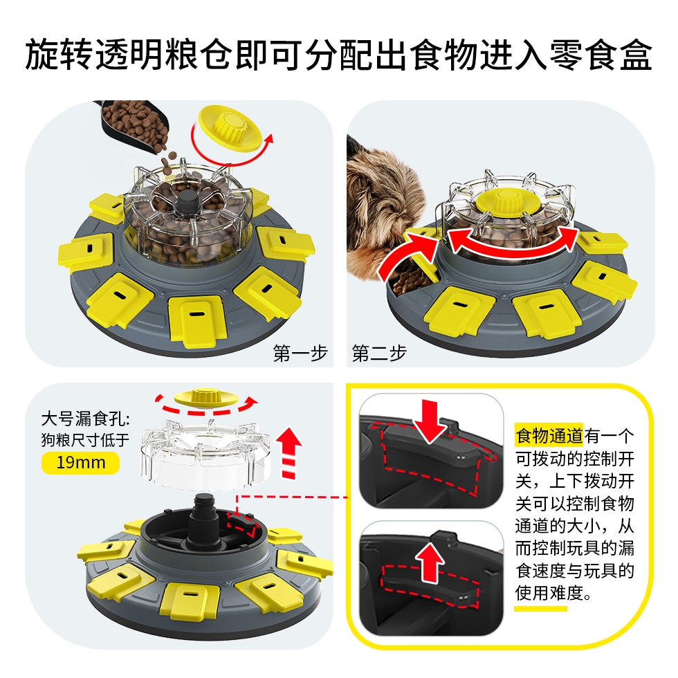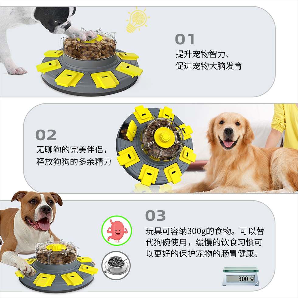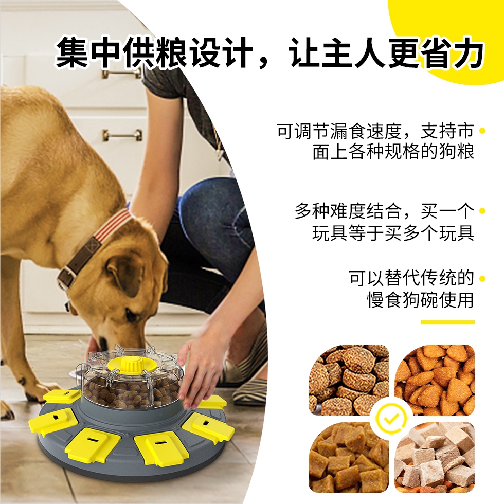 代号:智慧幸运转盘 这款玩具采用了创新设计,将提升宠物智力的功能和慢食餐具进行结合。它与以往传统的宠物益智玩具不同,这款玩具属于入门级和进阶级相结合的产品。这款产品是让狗狗通过主动获取食物奖励来变得更聪明的玩具,玩具使用了集中供粮设计,只需要加入一次食物就能使用超过30分钟。可以实现益智玩具的功能,增加玩具与宠物的互动效果。将宠物干粮加入透明外壳内的粮仓后,狗狗转动这个透明的外壳,食物会被分配到周边的零食盒内,狗狗翻开食物盒盖就可以获得食物。这个玩具还可以作为慢食餐具给宠物使用,矫正宠物快速饮食的不良习惯,维护宠物肠胃健康。